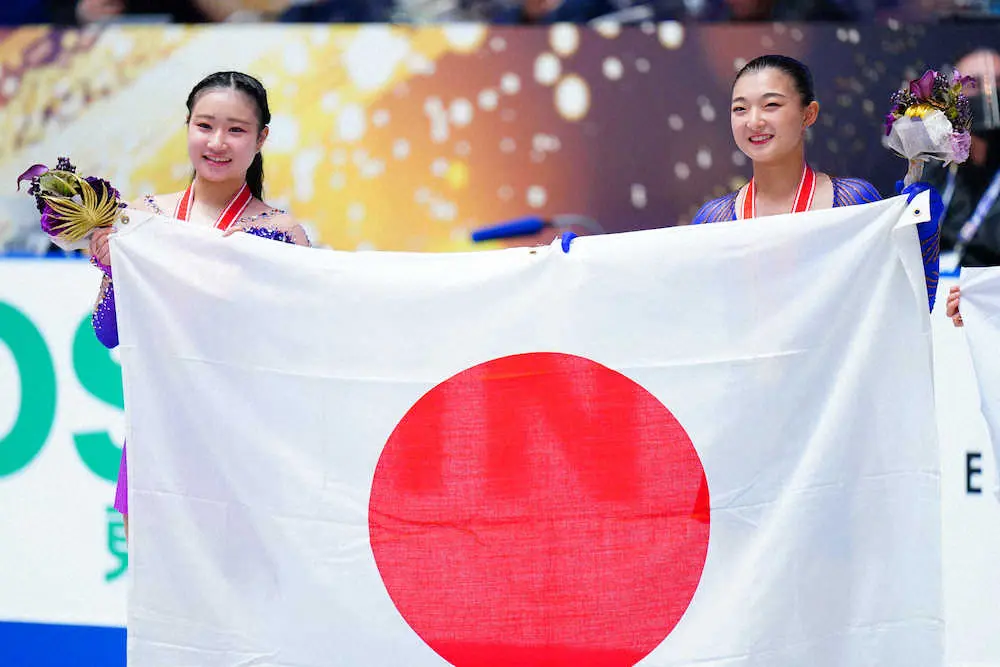女子フリー、優勝し笑顔の坂本花織(右)と2位の河辺愛菜(撮影・小海途 良幹)