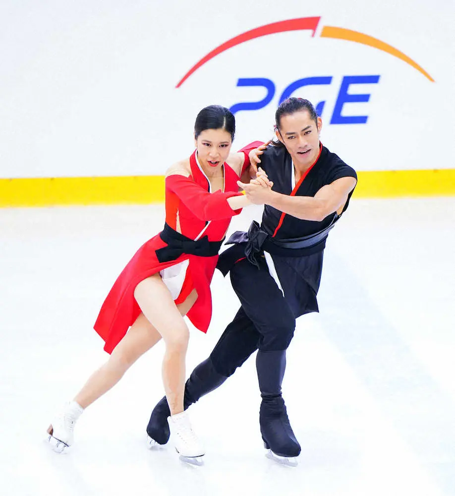 先週のGPシリーズ第4戦・NHK杯では、初めての国際連盟公認スコアとなる70・74点。2週連続の実戦となった今大会は演技直前の5分間練習で2人とも転倒するアクシデントがあったが、「ソーラン節&琴」の和のプログラムを熱く舞った。