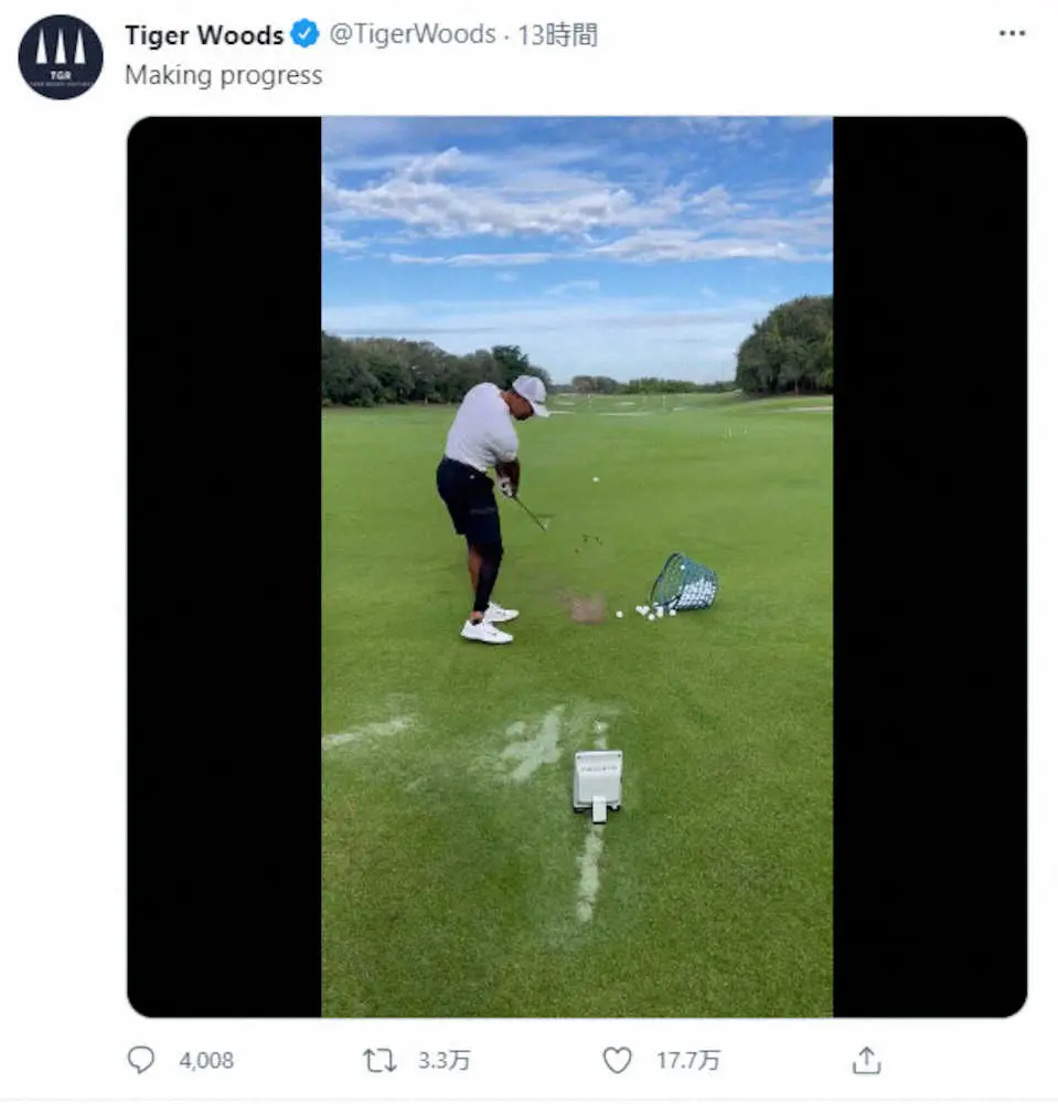 2月の自動車事故で右脚に重傷を負った男子ゴルフのタイガー・ウッズ(45=米国)が21日、ショットを放つ3秒の映像を自身のツイッターで公開した。米メディアによるとウッズがボールを打つ姿を見せたのは事故後初めて。