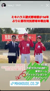 16年ぶり2度目の都市対抗出場を果たしたミキハウス。清水はストーリーズに「ミキハウス硬式野球部が16年ぶりに都市対抗野球本戦出場」「野球部のチームマスコットとしてベンチで応援します」などとつづり、ミキハウスのユニホームを着て、主将の大西友也内野手と柔道五輪3連覇の野村忠宏氏(46)との3ショットを投稿した。