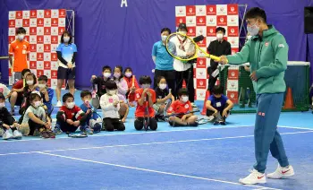 <錦織JALスペシャルテニススクール>笑顔を見せる錦織(撮影・久冨木 修)