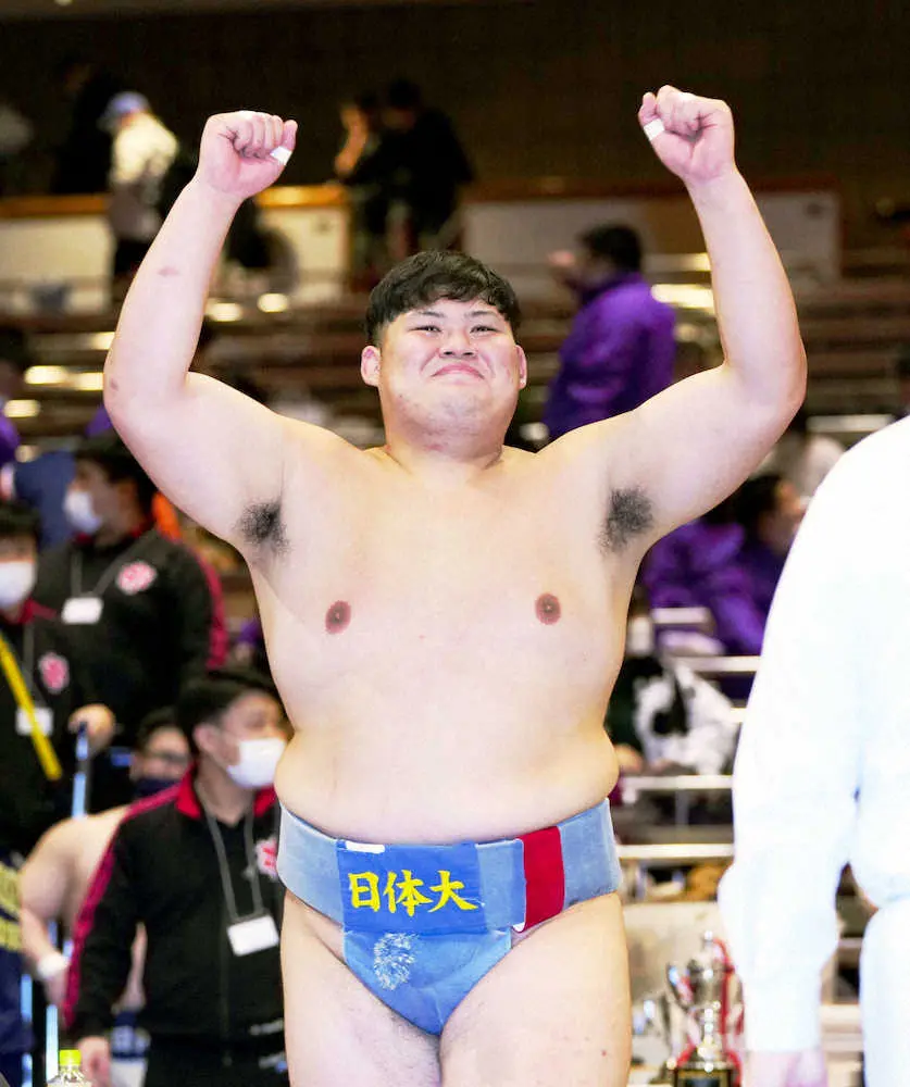 相撲の全日本選手権で優勝し、ガッツポーズする日体大・中村泰輝