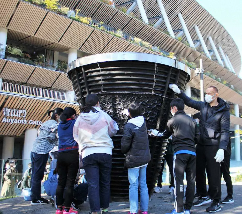 室伏スポーツ庁長官「新国立になってから初めてできた」笑顔で子供たちと炬火台磨き