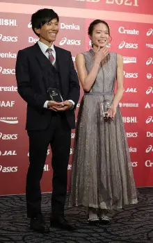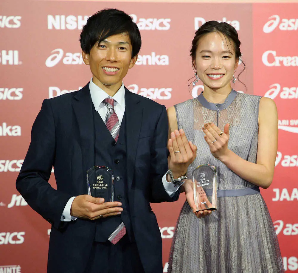 日本陸連の年間表彰式「アスレティックス・アワード」が9日、都内で行われ、今月1日に結婚を発表した男子マラソン日本記録保持者の鈴木健吾(26=富士通)と東京五輪女子マラソン8位入賞の一山麻緒(24=ワコール)の新婚カップルが初めて公の場に登場。鈴木は「すごく尊敬できる存在」と語り、一山も「(鈴木は)いつも謙虚で素晴らしい。2人で頑張っていきたい」と笑顔を見せた。