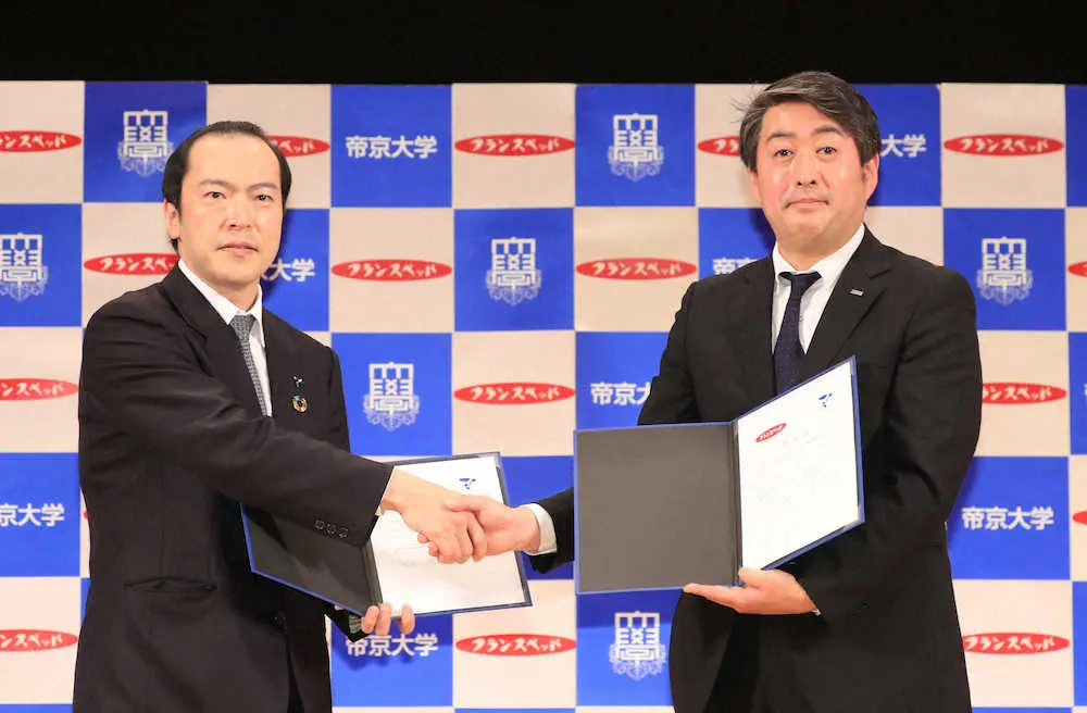 箱根駅伝(来年1月2、3日)に出場する帝京大が15日、八王子キャンパスで記者会見を行い、「フランスベッド」とユニホームのロゴスポンサー契約を結んだと発表した。調印式が行われ、中野孝行監督は「良質な睡眠が成績につながる。強化に役立てたい」と話した。