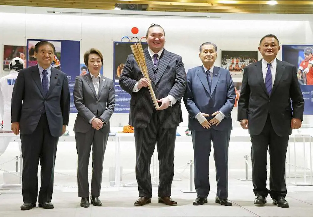 聖火リレーに参加できなかった間垣親方にトーチなどを贈呈するイベントで、写真に納まる間垣親方(中央)、橋本聖子・東京五輪・パラ組織委会長(中央左)、森喜朗・同前会長ら。左端は遠藤利明・同副会長、右端は山下泰裕JOC会長