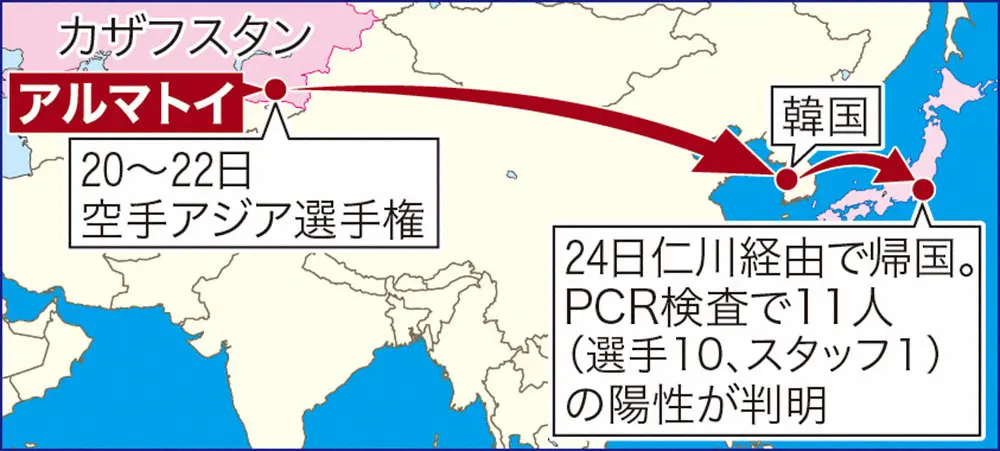 全日本空手道連盟は25日までに、カザフスタン・アルマトイで開催されたアジア選手権に派遣していた日本選手団28人のうち、11人が新型コロナウイルスの陽性反応を示したと発表した。同連盟によると、24日に帰国した際のPCR検査で選手10人、スタッフ1人が陽性となった。名前は公表していない。新変異株「オミクロン株」かどうかの判定には数日を要する見込み。
