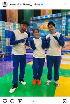 石川佳純 木梨憲武、水谷隼と「ピクトグラム」衣装の3ショットに「いい笑顔」