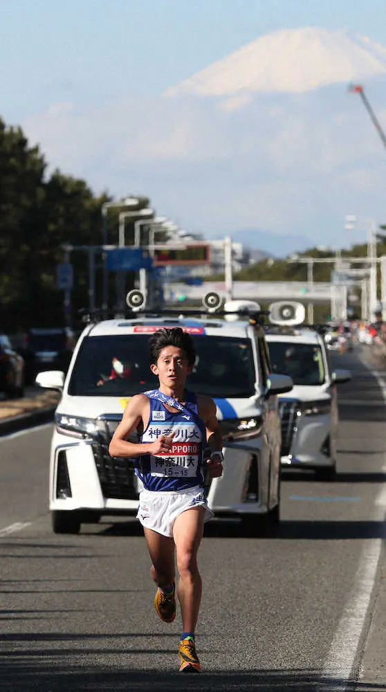 <第98回箱根駅伝復路・茅ヶ崎雑観>8区、富士山をバックに力走する・神奈川大・大泉(撮影・村上 大輔)
