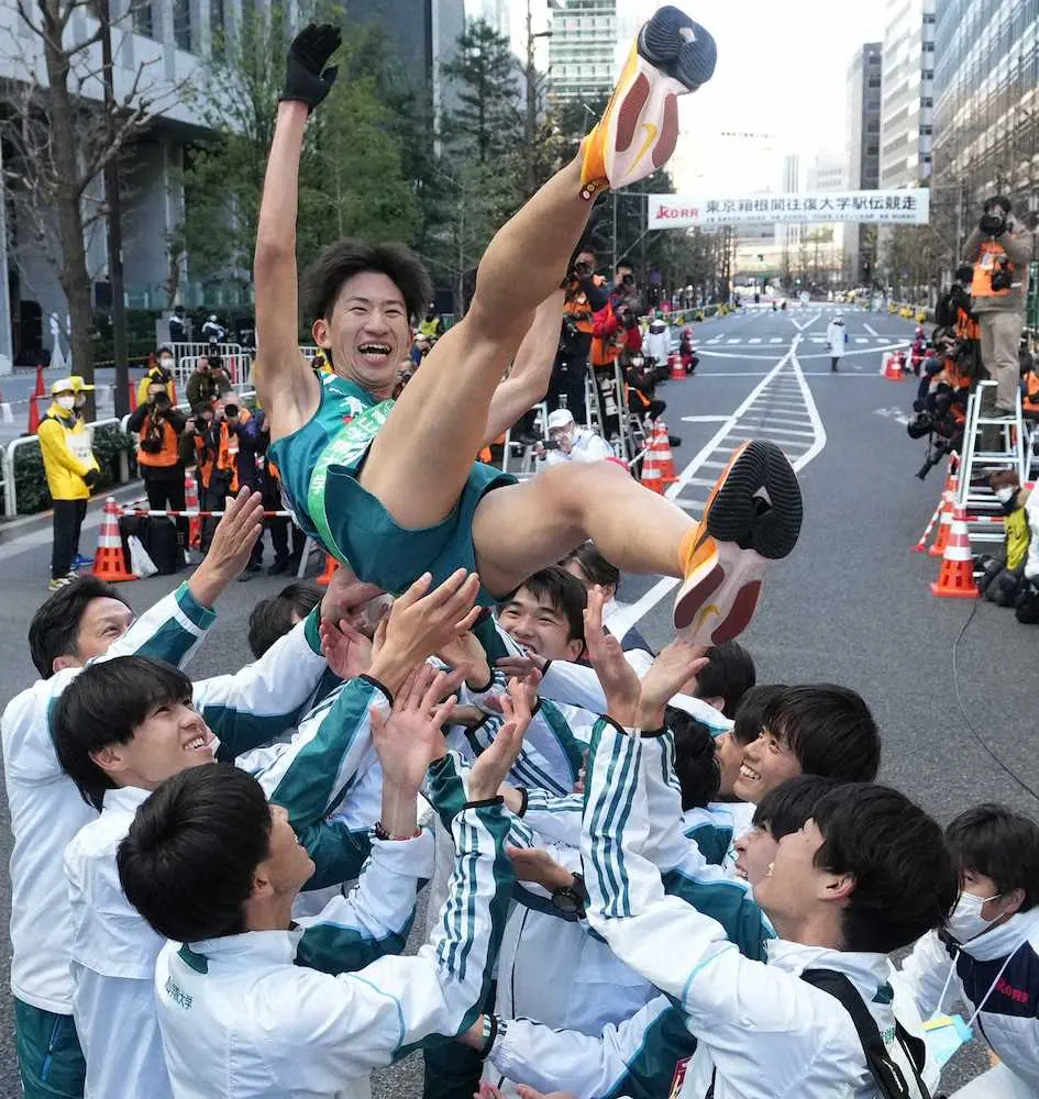 総合優勝を決め胴上げされる青学大アンカーの中倉