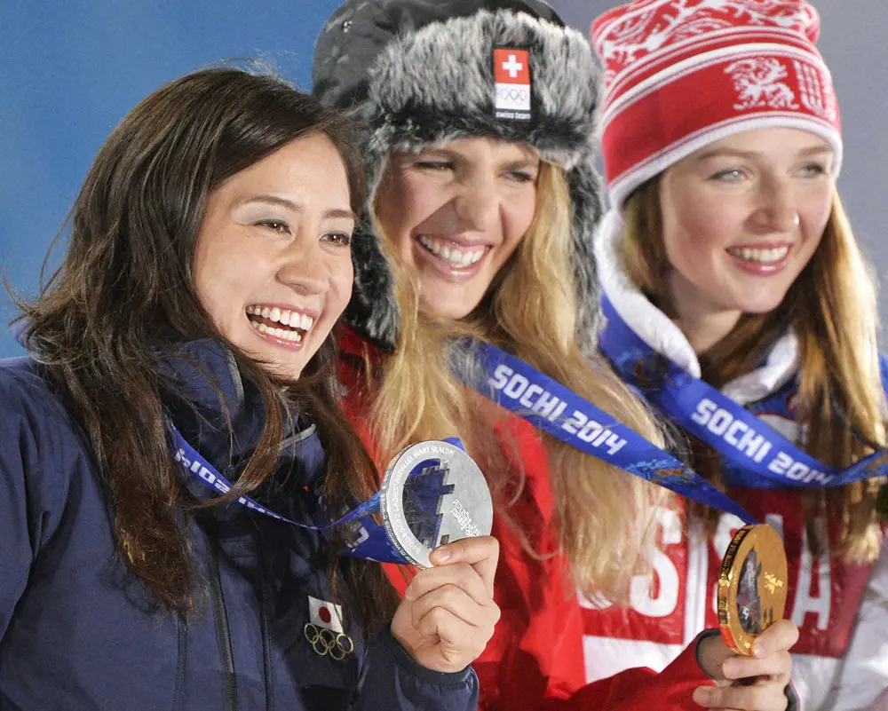 2014年ソチ五輪の表彰式で、金メダルを手に笑顔のパトリツィア・クンマー(中央)、左は銀の竹内智香(共同)