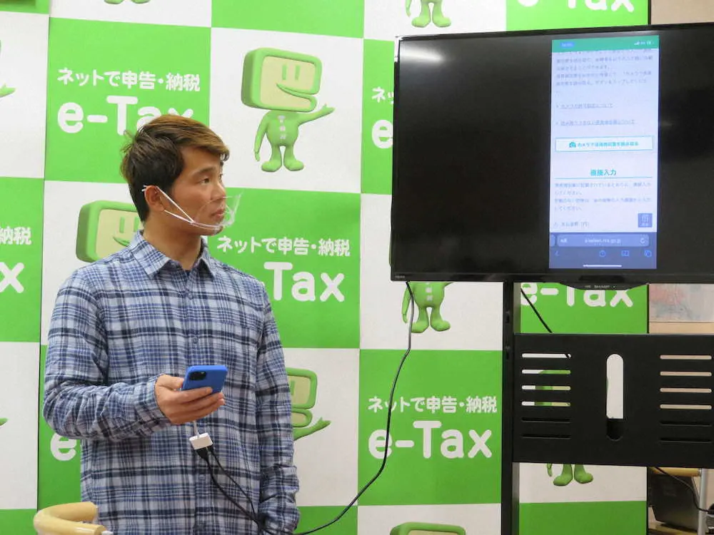 茂原税務署、麹町税務署の広報大使に就任し、スマホでの確定申告を体験する大原洋人