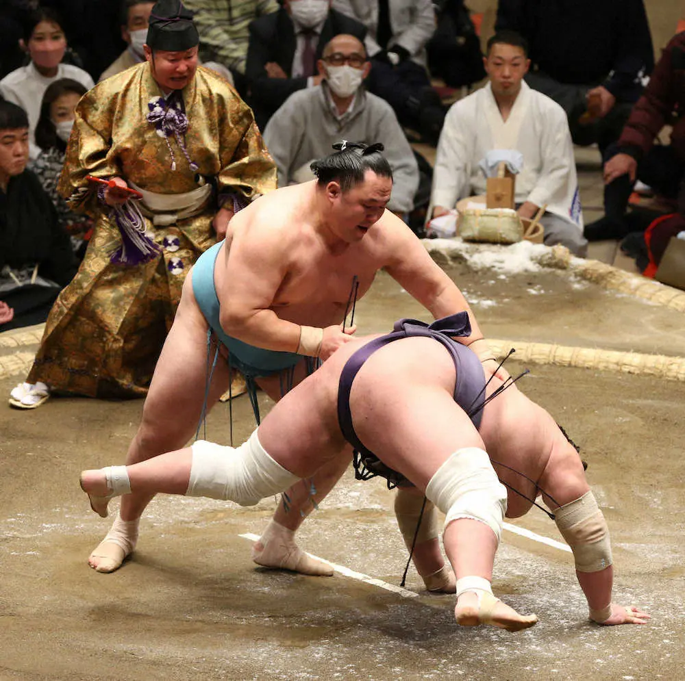 得意の突き押し。自身の代名詞を信じ、それを貫いた。立ち合いから圧力をかけ、与えた左前まわしは左右の喉輪で押しながら切った。「ちょうどいいタイミング」と相手が前につんのめったところを見逃さず、首根っこを押さえながら突き落としを決めた。前日は幕内通算1100回出場の節目に大関・正代を撃破。その勢いで照ノ富士からは17年名古屋場所以来の勝利を挙げ「何回も当たって土俵際までいって、いつも負けていた。ようやく勝てて良かった」と弾むような声を響かせた。