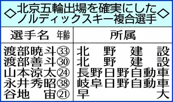 ノルディックスキーの複合男子は16日、全日本連盟が定めた2月の北京五輪の代表選考期間が終了し、派遣基準を満たした渡部暁斗と弟の善斗(ともに北野建設)、山本涼太(長野日野自動車)ら5人の代表入りが確実になった。連盟は同日までのW杯個人総合上位5人を代表に選ぶと定めており、5大会連続出場で金メダルを狙う渡部暁らが代表権を獲得する見込みとなった。