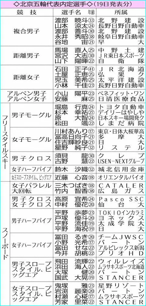 全日本スキー連盟は19日、発表済みだったノルディックスキー・ジャンプ以外の北京五輪代表内定選手46人を発表した。