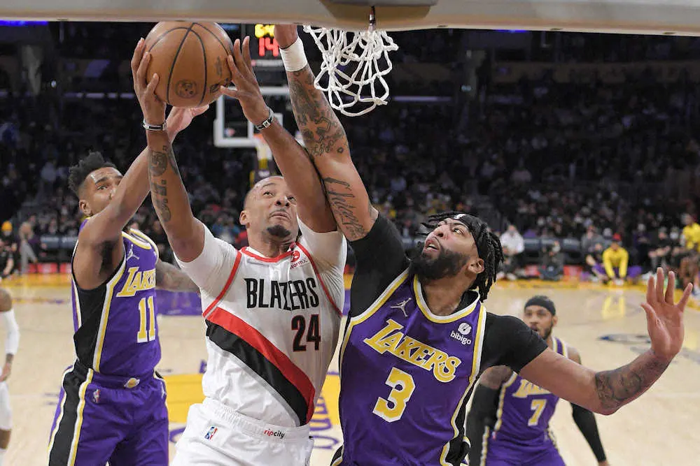 NBAは2日に各地で9試合を行い、レブロン・ジェームズ(37)が膝の故障で離脱してから3連敗を喫していたレイカーズは、地元ロサンゼルスでトレイルブレイザーズを99―94(前半54―53)で下して25勝27敗。復帰4戦目となったアンソニー・デービス(28)が30得点と15リバウンド、4ブロックショットをマークして4試合ぶりに白星をもぎとった。