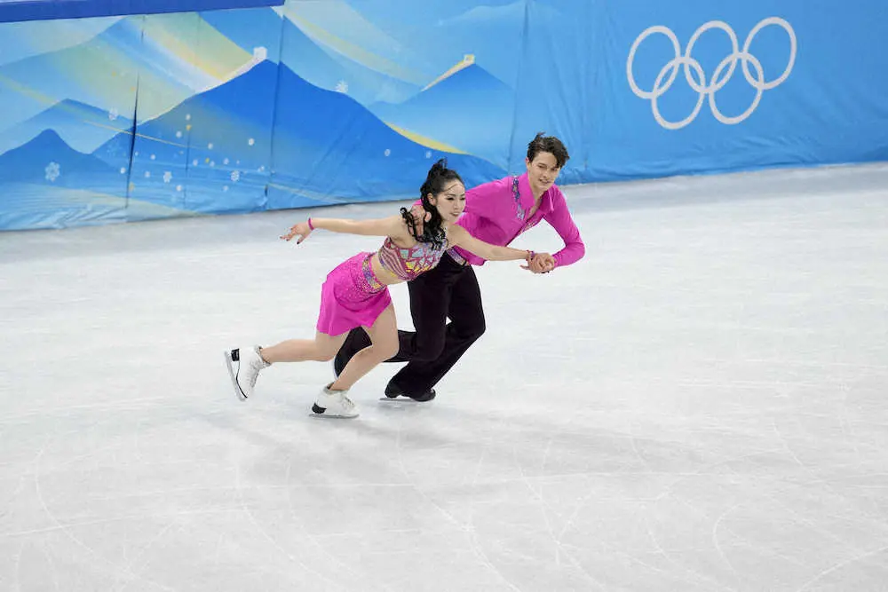 北京五輪フィギュアスケートの公式練習が3日、会場の首都体育館で行われた。アイスダンスの小松原美里、尊組(倉敷FSC)は日本時間午後1時5分から本番リンクで調整した。