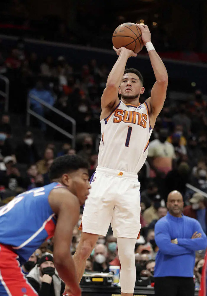 八村の前でジャンプシュートを放つサンズのブッカー(AP)