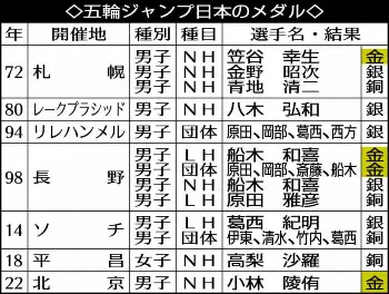 ▽日の丸飛行隊の表彰台独占 1972年2月6日、宮の森ジャンプ競技場で行われた札幌五輪のスキージャンプ70メートル級(現ノーマルヒル)で、日本勢が金、銀、銅メダルを獲得した。1本目でエースの笠谷幸生が最長不倒の84メートルを飛んでトップに立つと、青地清二が2位、金野昭次が3位、藤沢隆が4位と日本勢が上位に並んだ。スタート位置が下げられた2本目では、金野が2位、青地が3位と順位が入れ替わったが、外国勢の逆転は許さなかった。笠谷は落ち着いて79メートルを飛び、金メダル。日本勢が表彰台を独占し、「日の丸飛行隊」という言葉が生まれた。