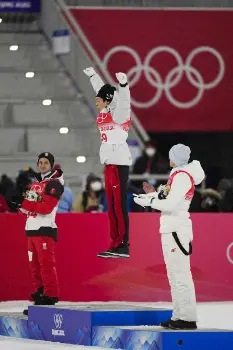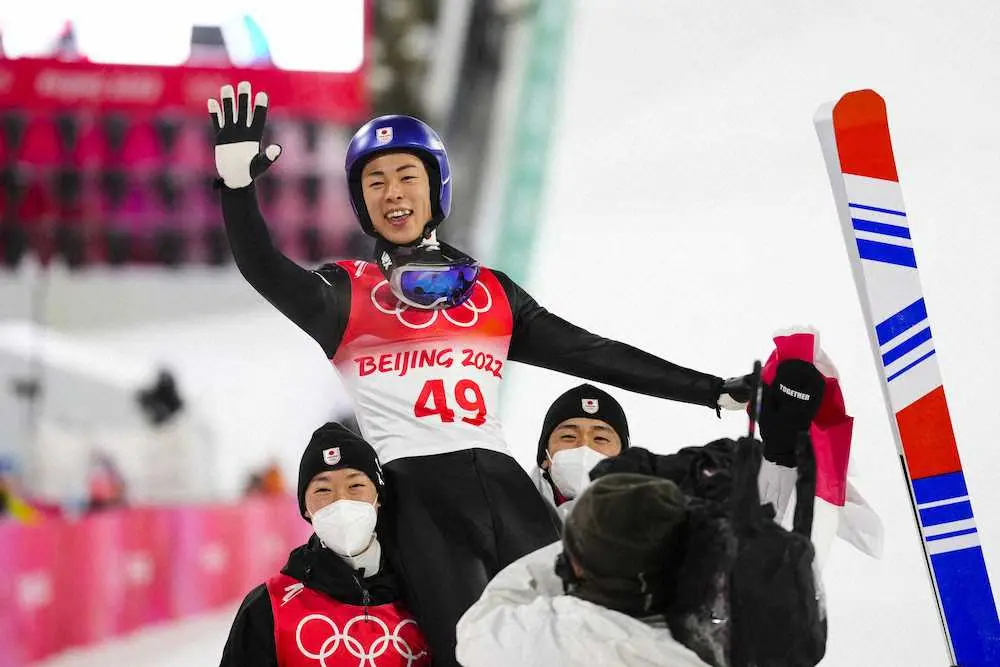 陵侑が中国の夜空をぶっ飛んだ。2本目を終えて金メダルが決まった瞬間、兄・潤志郎ら仲間に担がれ、日の丸の旗を手に笑顔がはじけた。スキー・ジャンプで日本人が24年ぶりに頂点に立った。