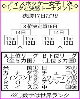▼競技方式 出場10チームによる1次リーグは世界ランキングにより5チームずつA、Bの2組に分けて、1回戦総当たりの勝ち点制で実施。A組の全チームとB組の上位3チームが準々決勝へ進む。準々決勝は「A組1位とB組3位」「A組2位とB組2位」「A組3位とB組1位」「A組4位とA組5位」が対戦する。ランキング1位の米国と同2位のカナダの力が突出しており、B組1位となることが準決勝進出のカギとなる。