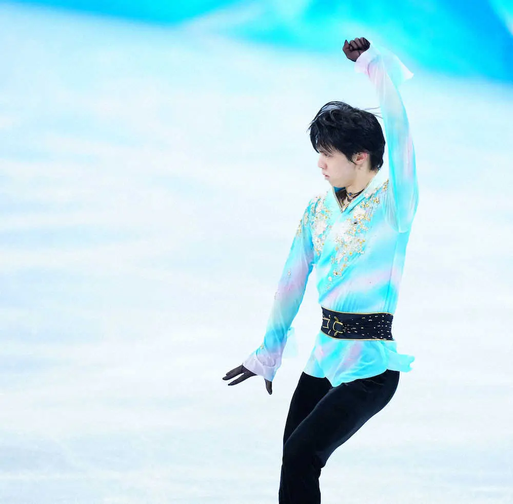 <北京五輪・フィギュア>男子フリー、演技を終えた羽生結弦は手についた氷を握りしめる(撮影・小海途 良幹)