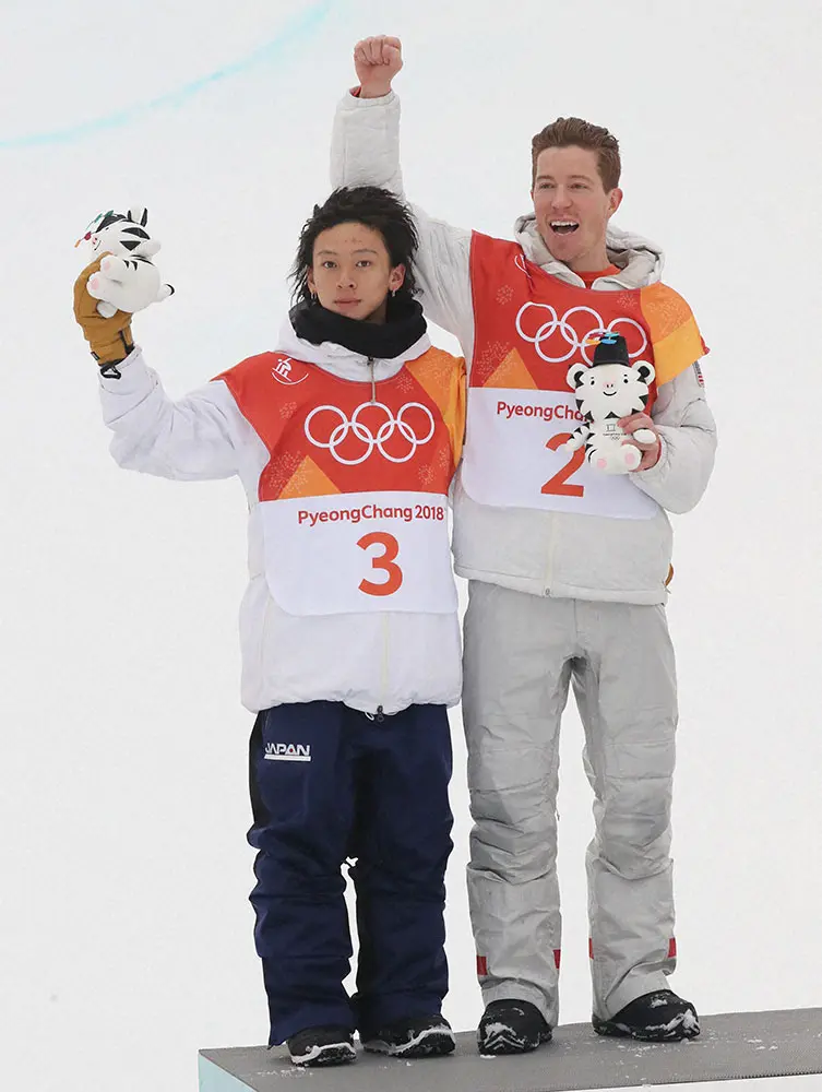 平昌冬季五輪・スノーボード男子ハーフパイプ決勝で銀メダルを獲得し、表彰台で金メダルのショーン・ホワイト(右)と記念撮影する平野歩夢(撮影・椎名 航)