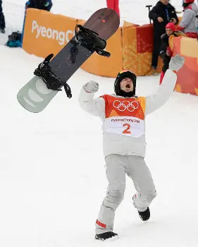 平昌冬季五輪・スノーボード男子ハーフパイプ決勝で金メダルを獲得し、ボードを投げて雄叫びをあげるショーン・ホワイト(AP)