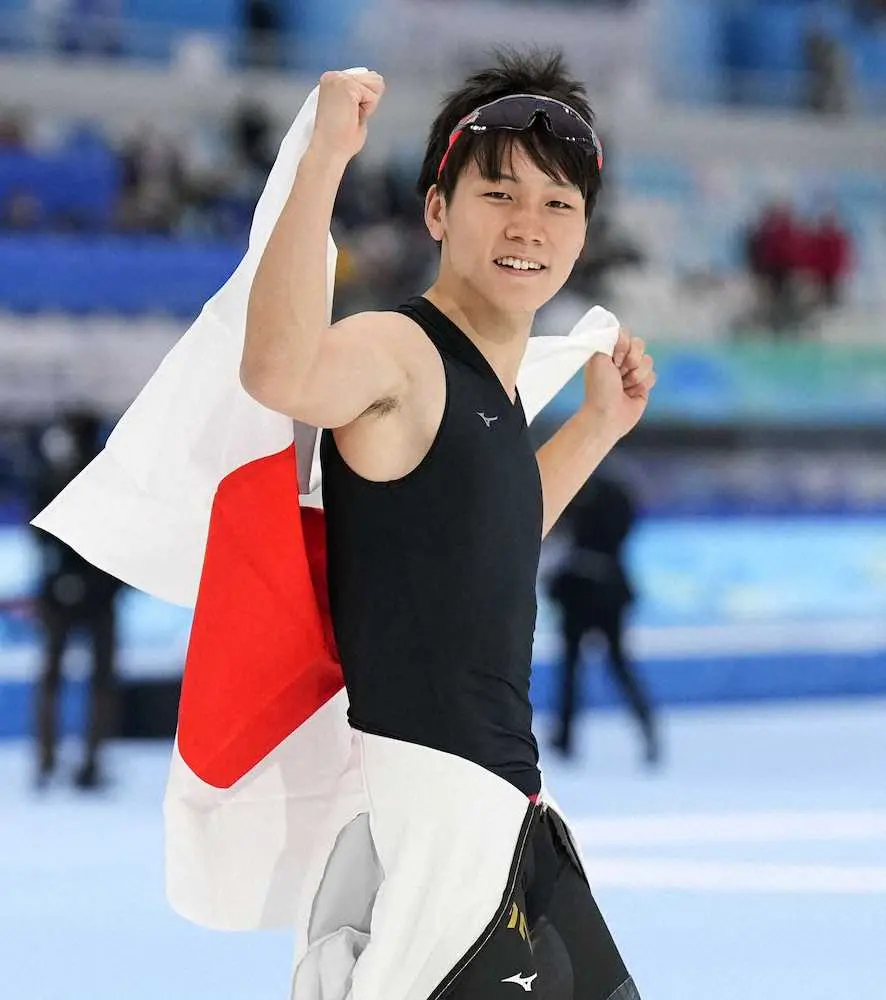 スピードスケート男子500メートルで銅メダルを獲得し、日の丸を広げ笑顔の森重航(共同)