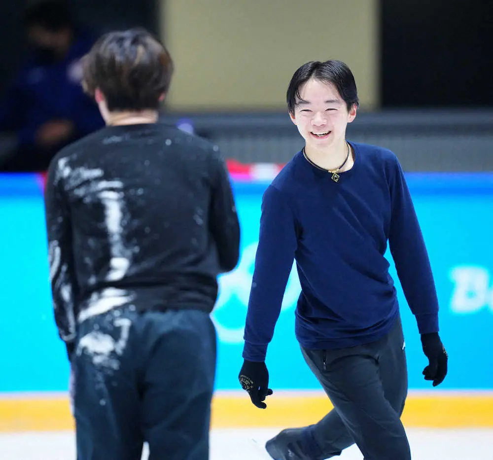 北京五輪フィギュアスケート団体戦銅メダルを獲得し、男子で銀メダルの鍵山優真(オリエンタルバイオ・星槎)、銅メダルの宇野昌磨(トヨタ自動車)が13日、首都体育館近くのサブリンクで割り当てられた公式練習に参加した。