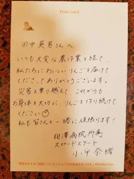 20~21年は台風被害を受けた長野県のリンゴ農家を勇気づけるため、リンゴ模様の赤いユニホームを着用。リンゴ農家を営む田中英男さん(83)が「感動した!」と反応した。水害で家が全壊し、19年の収入はほぼゼロ。それでも20年は再びリンゴが実り「小平さんに食べてほしい」と面識のない小平にリンゴ10キロを贈った。小平は知人のつてで田中さん宅を探してサプライズ訪問。収穫時期で留守だったため、はがきに直筆メッセージを書き感謝を伝えた。