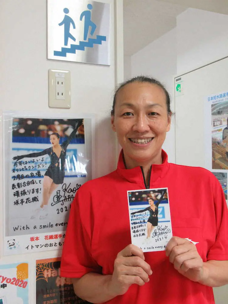 坂本から届いたハガキを手に笑顔の羽谷明美コーチ