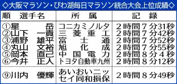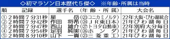ゴール目前でサングラスを外し、笑顔でテープを切った。1メートル63、49キロと小柄な星が大阪、びわ湖毎日の記念すべき統合後初の大会で初マラソン日本最高記録を11秒更新する好タイムで優勝。24年パリ五輪へまた一人新星が現れた。
