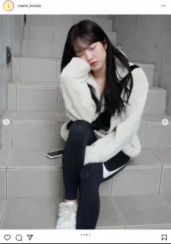 前面全体に大きくナイキマークが入ったボアジャケットに、黒のレギンススタイルでポーズを決める画像を投稿。寝顔のポーズをとっている画像もアップした。