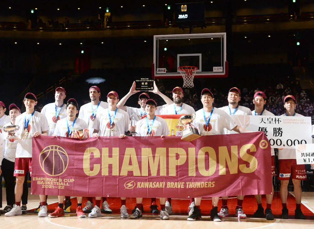 バスケットボールの第97回天皇杯全日本選手権は12日、さいたまスーパーアリーナに9196人の観衆を集めてB1勢同士の決勝が行われ、川崎が82―72で千葉Jを破り、2大会連続5度目の優勝(前身の東芝神奈川時代を含む)を飾った。