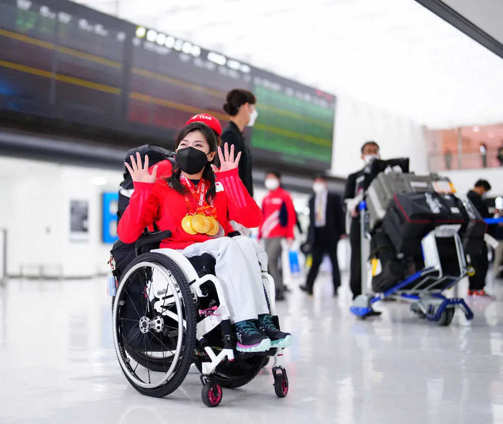 北京パラリンピックに出場した日本選手団が14日、成田空港に帰国した。選手団主将の村岡は計4つのメダルを首にかけて到着ロビーに姿を見せた。黒いマスク姿で目尻を下げ、報道陣に「ありがとうございます」とあいさつし、手を振って空港を後にした。