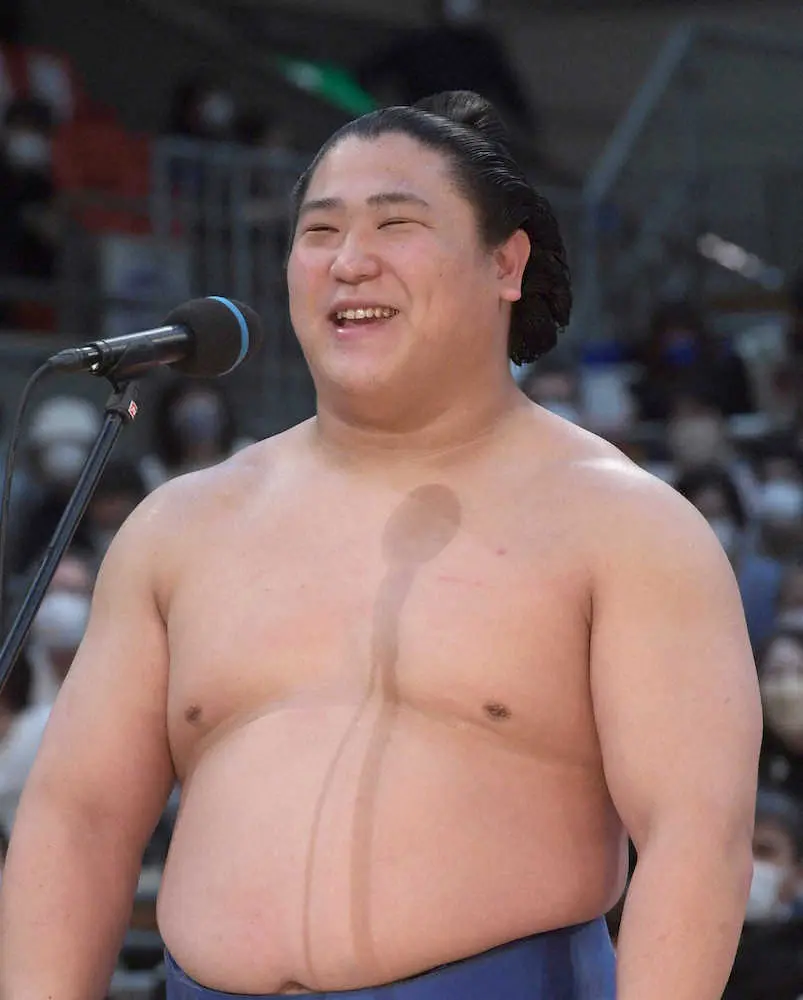 優勝し、インタビューで満面の笑顔を見せる若隆景