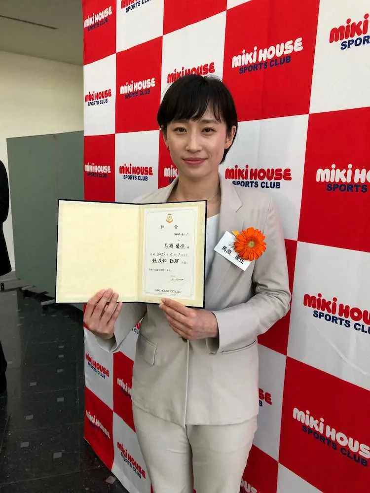 今年1月に現役復帰した飛び込みの馬淵優佳が大阪府八尾市内でミキハウスの入社式に出席した。新卒を含めた同期社員20人と晴れ舞台に臨み「凄く新鮮で、周りの人もパワフル。年齢も少ししか変わらないのにパワーをもらった。競技に生かしていきたい」と笑顔。
