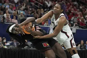 全米大学バスケットボール女子のNCAAトーナメントは1日、ミネソタ州ミネアポリスで「ファイナル4」の2試合を行い、初優勝を狙っていたルイビル大(ケンタッキー州)は58―72(前半28―34)でサウス・カロライナ大に敗れて決勝進出を逃した。