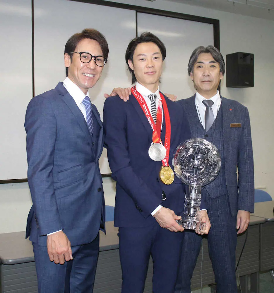 トロフィーと金メダルを手にポーズをとる小林陵(中央)。左は葛西兼任監督、右は土屋ホーム・山川社長
