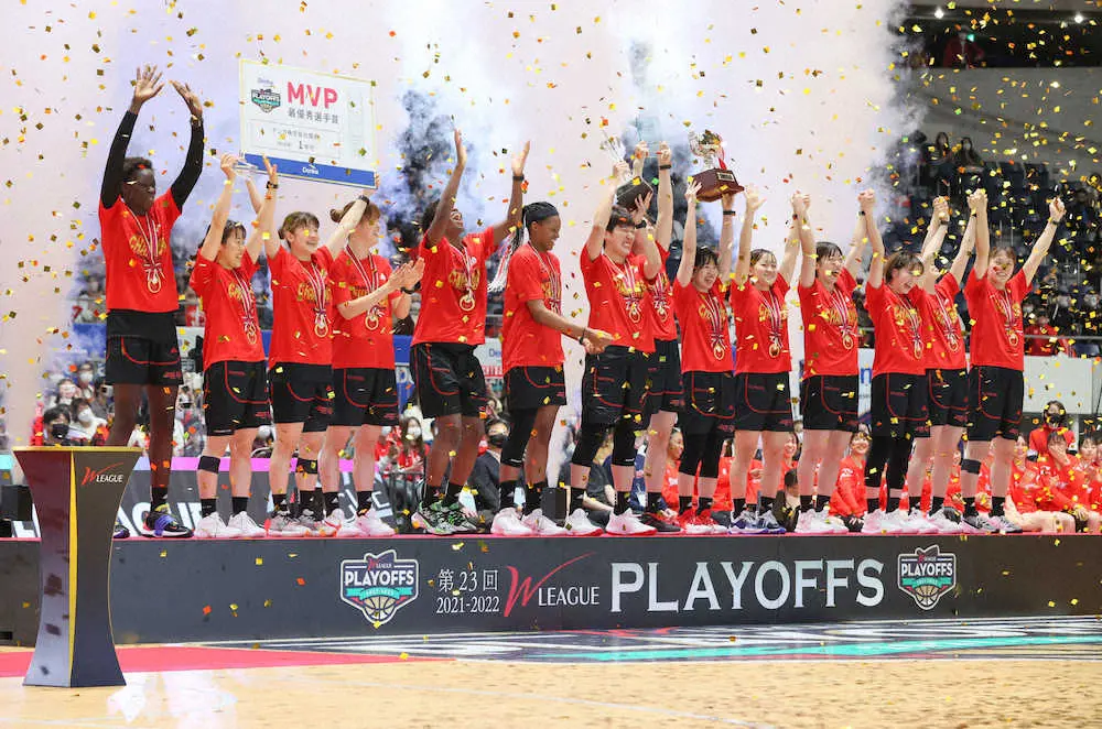優勝インタビューで、トヨタ自動車の馬瓜エはリーグ史上最多の観衆に向け「新しい歴史をつくりました!」と絶叫した。昨年12月の皇后杯準々決勝で富士通に敗戦。その後は「泥くさいトヨタ」をスローガンに意識改革に取り組み、選手間で深夜まで意見をぶつけ合うこともあった。昨年はベンチから出る機会が多かった山本、馬瓜ス、ソラが主力に成長。今季限りで引退する東京五輪銀メダルメンバーの三好は「心置きなく引退できる」と歓喜の涙を流した。