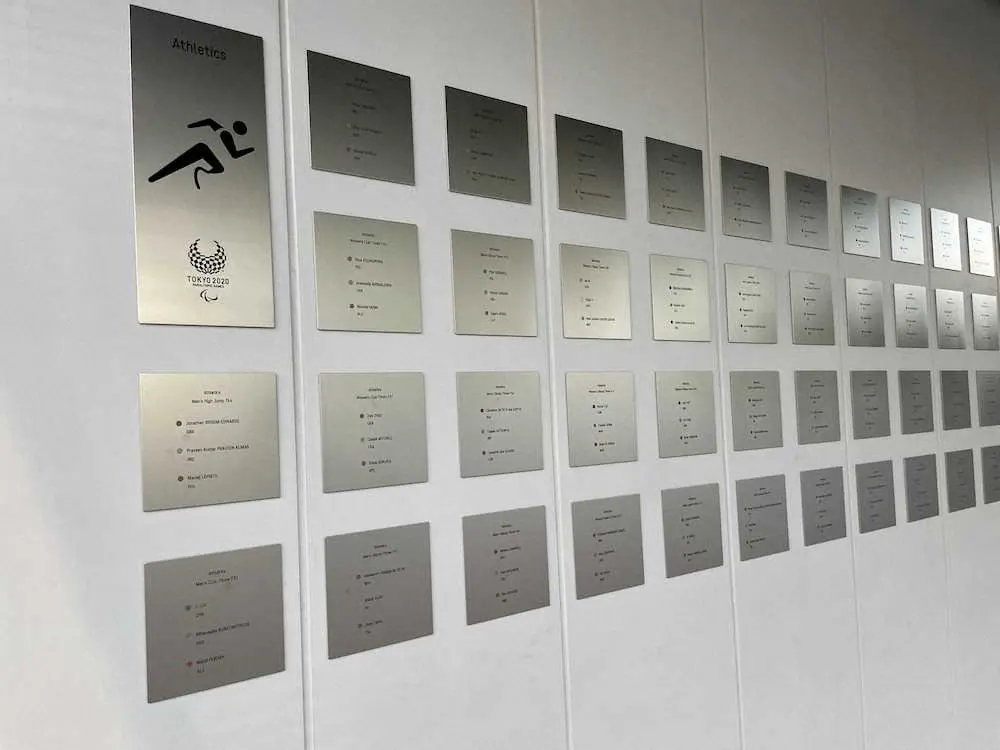 同銘板はメダリストを称えることを目的として、1928年アムステルダム大会から各開催都市の会場に設置され、全種目のメダリストや国名を表示。東京大会の銘板については「一般市民のアクセスが良く、憩いの場所となるもの」「名所(レガシー)として残るもの」「東京1964大会のレガシーや隣接するオリンピック博物館との相関性・調和性に配慮」などを検討したうえで、国立競技場1階ピロティの壁面に設置することを決めていた。