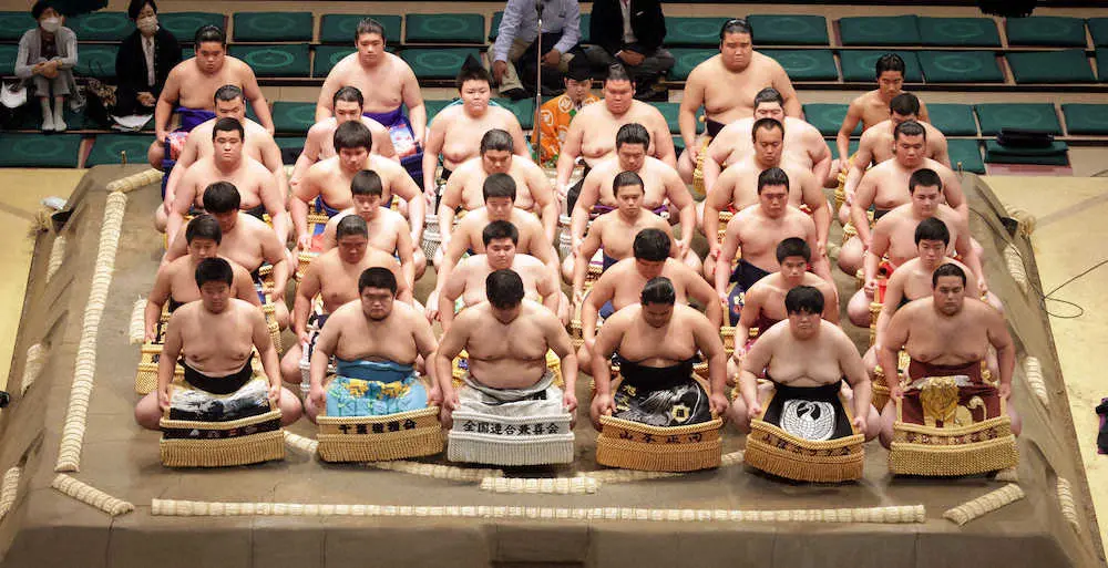 大相撲夏場所初日、三段目取組の途中で新序出世披露が行われ、休場力士1人を除く34人が化粧まわしを締めて土俵に上がった。本来は春場所中に行われるが、多くの新弟子が卒業式に出席するため、新型コロナウイルス感染予防の措置として前相撲を中止、新弟子検査を場所後に延期していた。