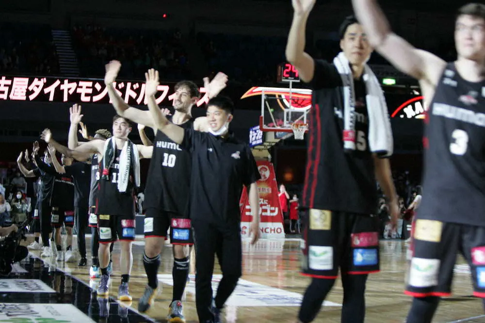 <大阪・名古屋>最終戦を終え、観客の声援に応える大阪エヴェッサの選手たち