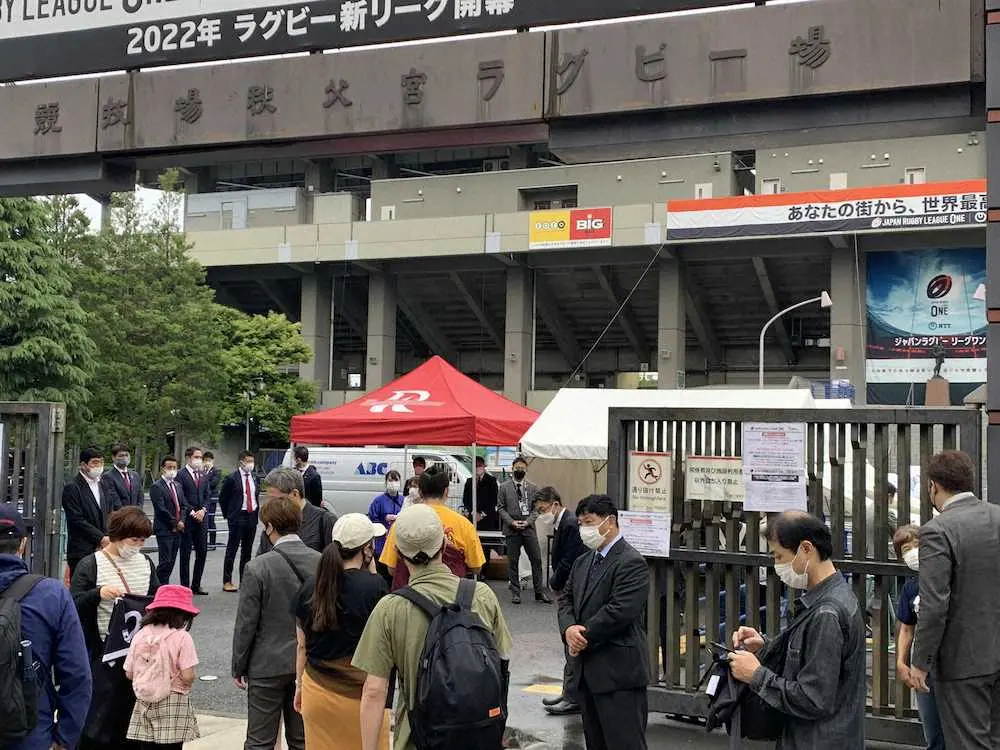 <BR東京・大阪>試合当日の中止が決まり、秩父宮ラグビー場を訪れたファンに謝罪や説明を行ったリーグワンの東海林一専務理事(中央)ら関係者
