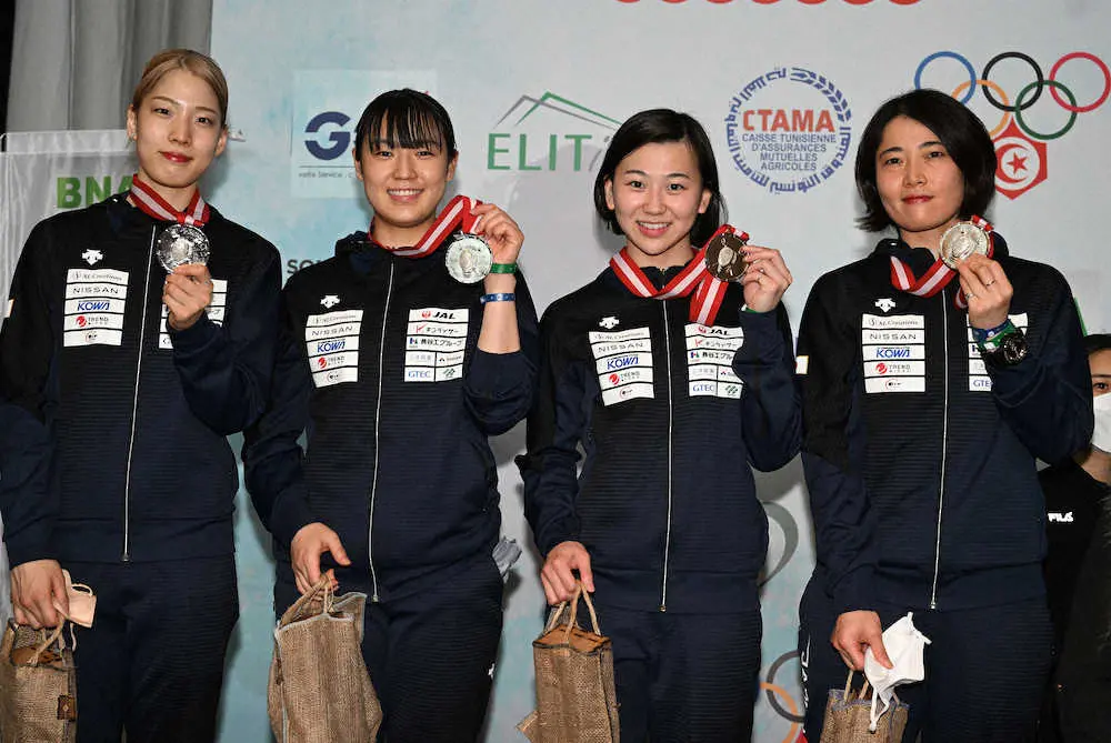 W杯チュニジア大会団体戦で銀メダルを獲得した日本チーム。左から江村美咲、福島史帆実、高嶋理紗、田村紀佳(日本フェンシング協会提供)