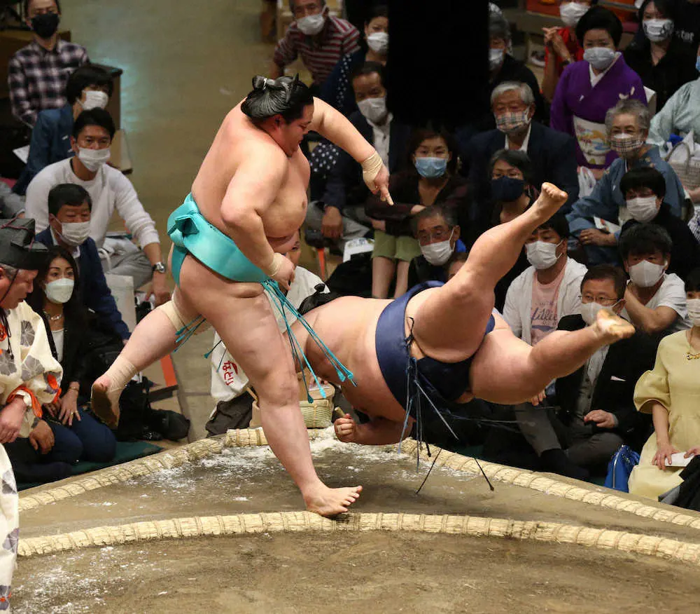 <大相撲夏場所3日目>突き落としで御嶽海を破る琴ノ若(左)(撮影・西海健太郎)