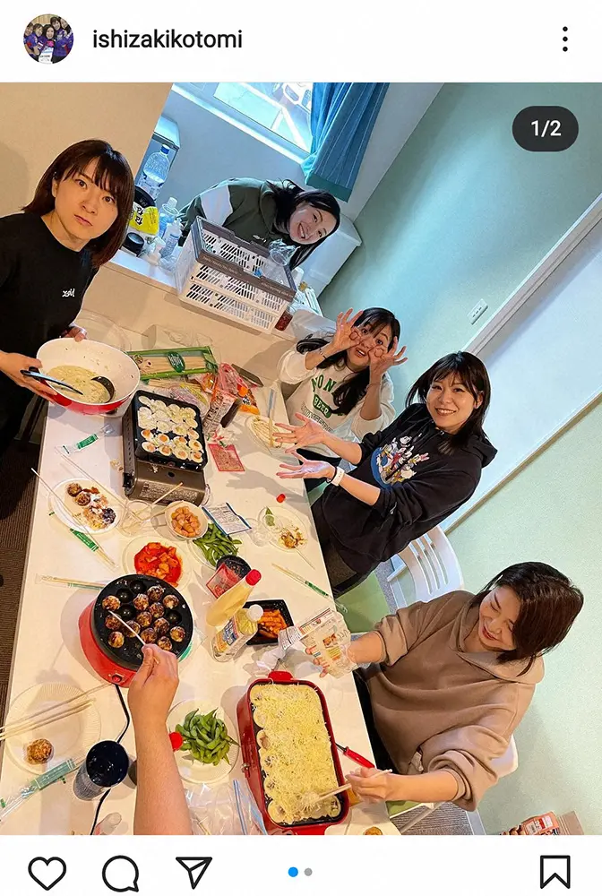 「よく練習しトレーニングしたご褒美に先週チームでたこ焼きパーティーをしました」とし、藤沢五月、吉田知那美、吉田夕梨花、鈴木夕湖と5人でテーブルを囲むショットをアップ。「#ロコタコパ #焼き台3 #アヒージョもしたよ」とハッシュタグを付け、たこ焼き器でアヒージョを作る動画も公開。吉田知那美は両手で頬をつまんで“たこ焼きポーズ”を取るなど、リラックスした様子を見せている。