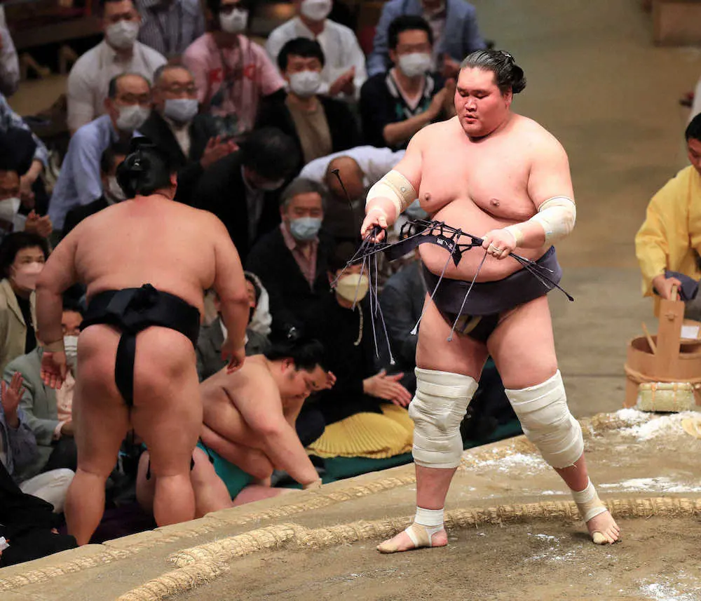 史上2位の年長記録となる35歳での初賜杯が期待される佐田の海は大栄翔と激しい立ち合い後、必死に突き出しを狙ったが、大栄翔のはたき込みに沈んだ。人気力士同士の対戦となったが、35歳の敗戦に国技館にはため息がもれた。大栄翔は4敗を死守し自力はないが優勝争いに踏みとどまった。