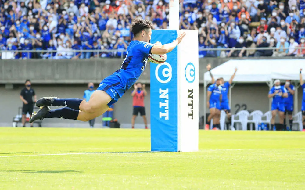 獲物を狙ったチーターのように仕留めた。7―3の前半終了間際、竹山は自陣右インゴール手前で、相手SOフォーリーのパスに反応。インターセプトに成功すると、そのまま約90メートル独走し、トライを奪った。「あのタイミングで狙っていた。理想通りのプレーができた」。鋭い嗅覚でパスコースを察知し、新リーグ最多の1万5482人が駆けつけた秩父宮を沸かせた。